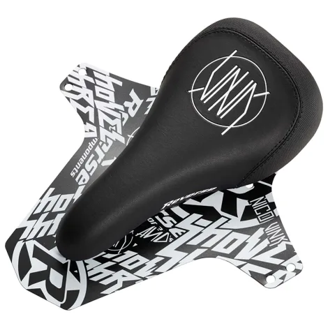 Nico is known for his incredible jumps and his hard and uncompromising riding style. He needed a sturdy and durable saddle with a shape that allowed him full freedom of movement and pinchable on tricks.   The Nico Vink Signature saddle is reinforced at the key points with Kevlar and offers optimal control on the bike with its increased flanks, even during airtime. The saddle was developed in close collaboration with Nico and fits perfectly with the design of the other Nico Vink Signature Series products!   The saddle comes with a free “Nico Vink Stickerbomb” fender   Features Length: 235 mm. Width: 127 mm. Weight: 260 g (+/- 5% weight tolerance). Material: CrMo (frame) / kevlar (edge protection) / vinyl (saddle cover).
